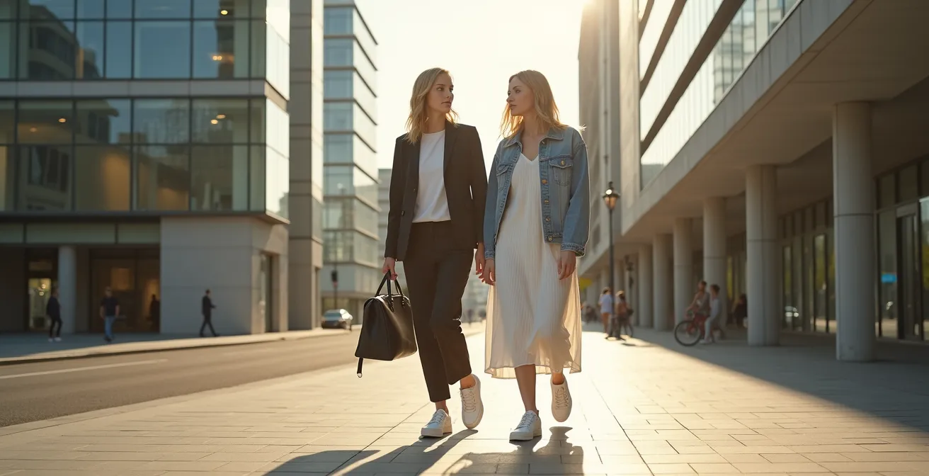 Eine bewährte Methode ist die Drei-Teile-Formel: Ein formelles Oberteil (z.B. Blazer und Bluse), eine hochwertige Hose (z.B. Wide-leg Jeans oder Stoffhose) und als Kontrapunkt ein Paar elegante Sneaker. Diese Kombination macht ein Outfit im Handumdrehen bürotauglich, ohne spießig zu sein. Der Kontrast zwischen dem sportlichen Schuh und den eleganten Komponenten schafft den charakteristischen Spannungsbogen, der den urbanen Chic ausmacht. Ob zu einer weiten Hose und einem Kurzblazer oder zu einem schlichten Strickkleid – der Sneaker erdet den Look und macht ihn alltagstauglich.